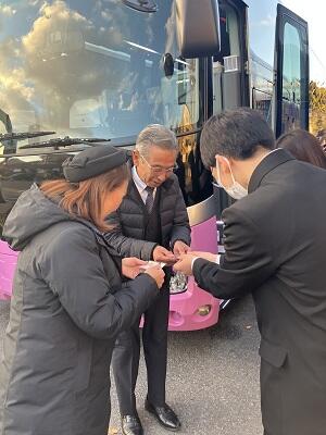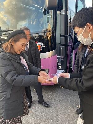 お世話になったバスの運転手さんとバスガイドさんに月形の花で作ったキーホルダーをプレゼントしました。